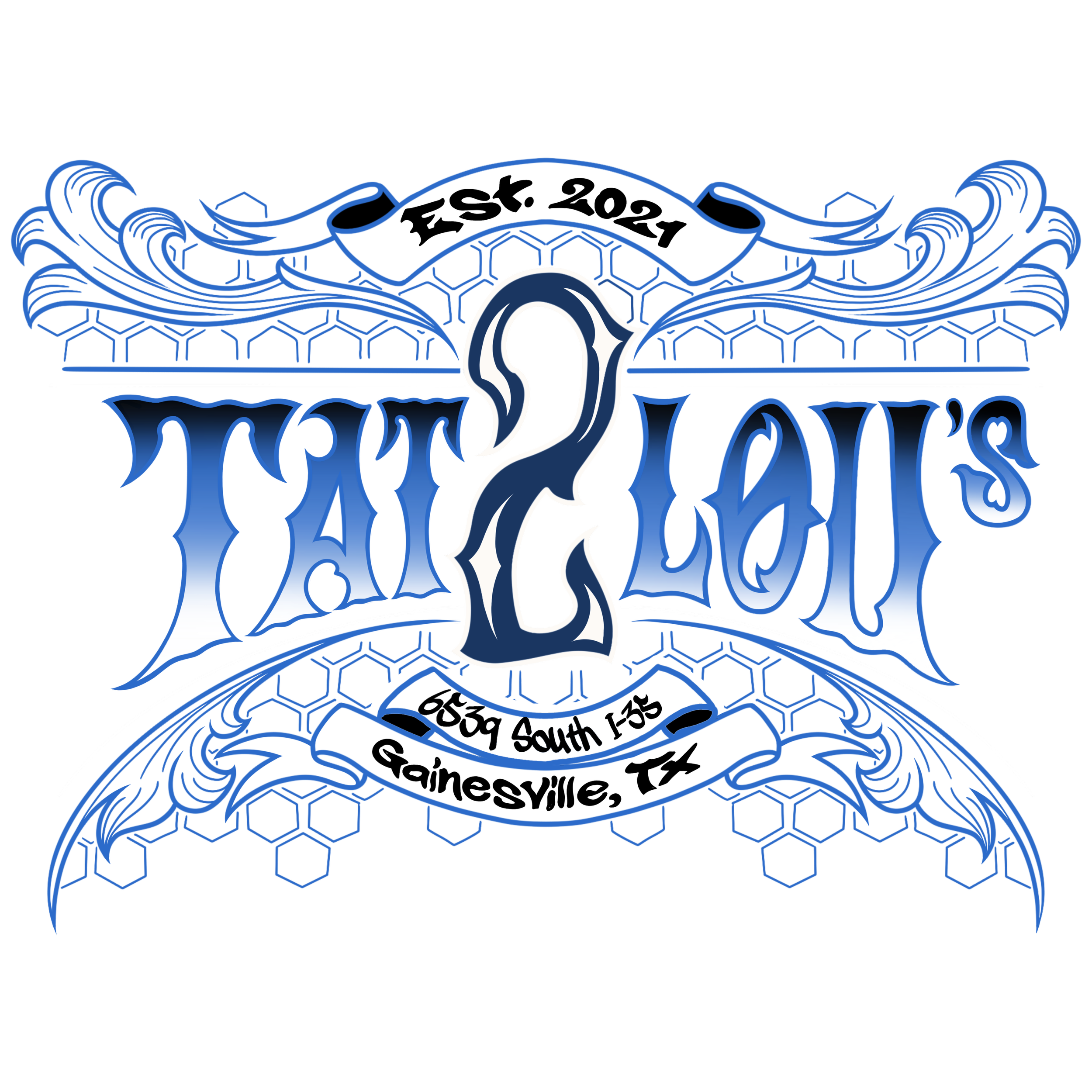Tat2Lou's tattoo shop logo with decorative waves and banners, established in 2021, located at 6539 South I-35, Gainesville, Texas.